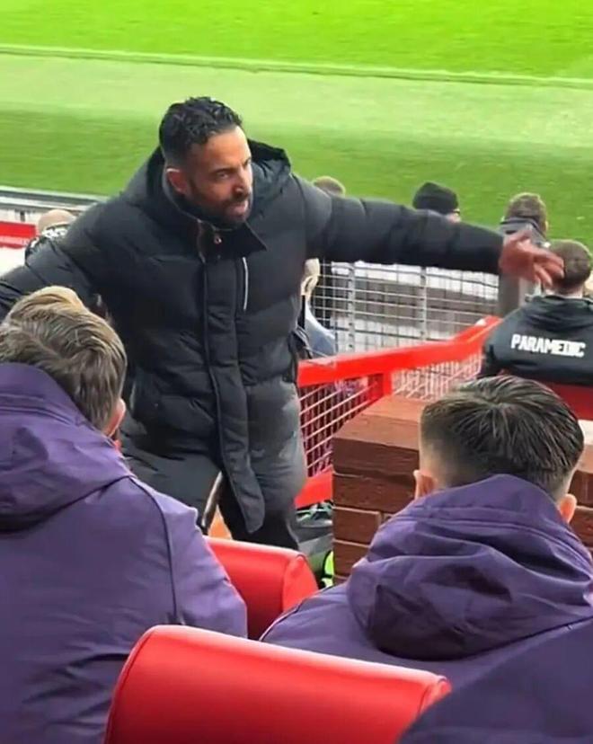 段视频拍摄到阿莫林爬上老特拉福德教练席的楼梯,摊开双臂向助教抱怨约罗的画面。他用葡萄牙语怒斥:「球已经滚动半小时了,莱尼(约罗)在干嘛?」