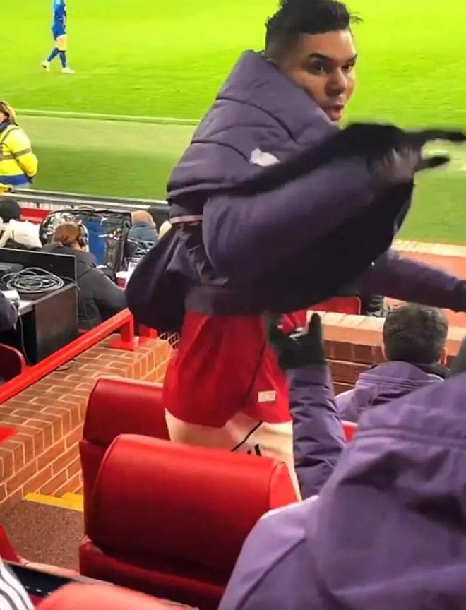 由于积累5张黄牌,卡塞米罗将无缘曼联的下一场比赛,他可能觉得自己没需要休息。因此,走下球场时,卡塞米罗垂头丧气,他摇着头,站在替补席上,把一瓶水摔在了地上。在朝右侧的人大声呼喊后,他拿起一件曼联外套穿上,但并没有注意衣服上下颠倒了。
